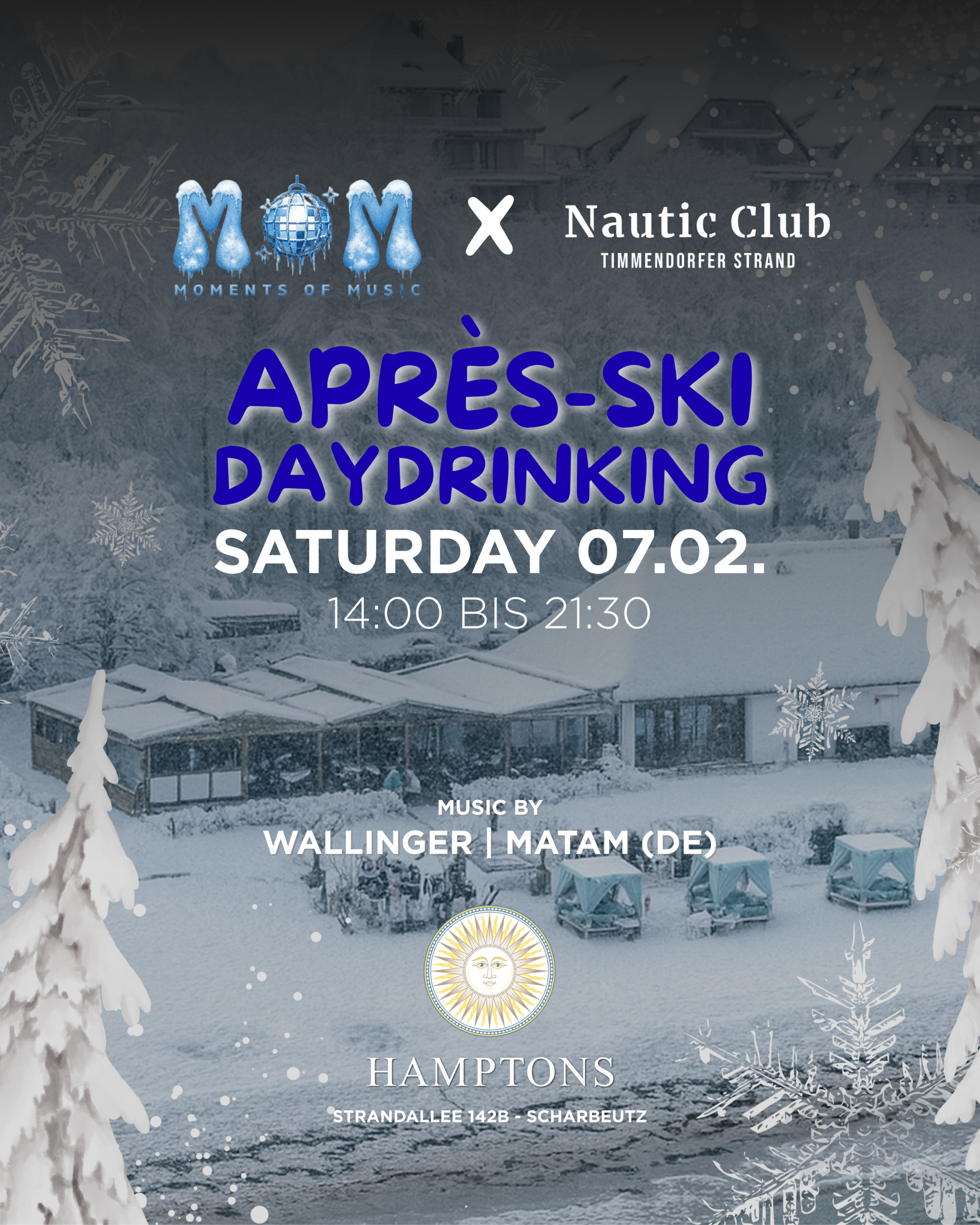 Am Samstag, den 07.02., feiern wir von 14:00 bis 21:30 Uhr stilvolles Après-Ski Daydrinking im Hamptons Scharbeutz. Winterliche Atmosphäre trifft auf entspannte Beats von Wallinger und Matam (DE). Für wohlige Wärme auf der Terrasse ist selbstverständlich gesorgt.